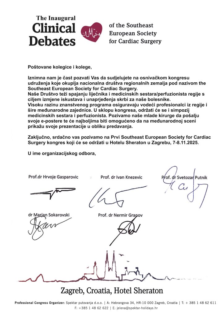 Ovim putem obavještavamo o nadolazećem 1. Kongresu kardiokirurškog društva jugoistočne Europe koji će se održati od 7. do 8.11.2025. u Hotelu Sheraton u Zagrebu. Program kongresa možete pronaći na web stranicama https://www.cardiacsurgery-debates2025.org/index.php.